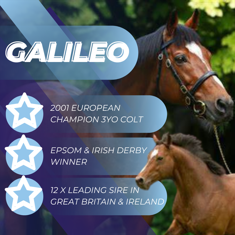 Galileo was a son of Saddler’s Wells. He was born in Ireland in 1998 and started his racing career in October 2000. Although he retired from racing in October 2001 he packed a lot into a short amount of time and in 2001 was named European champion Three Year Old Colt.